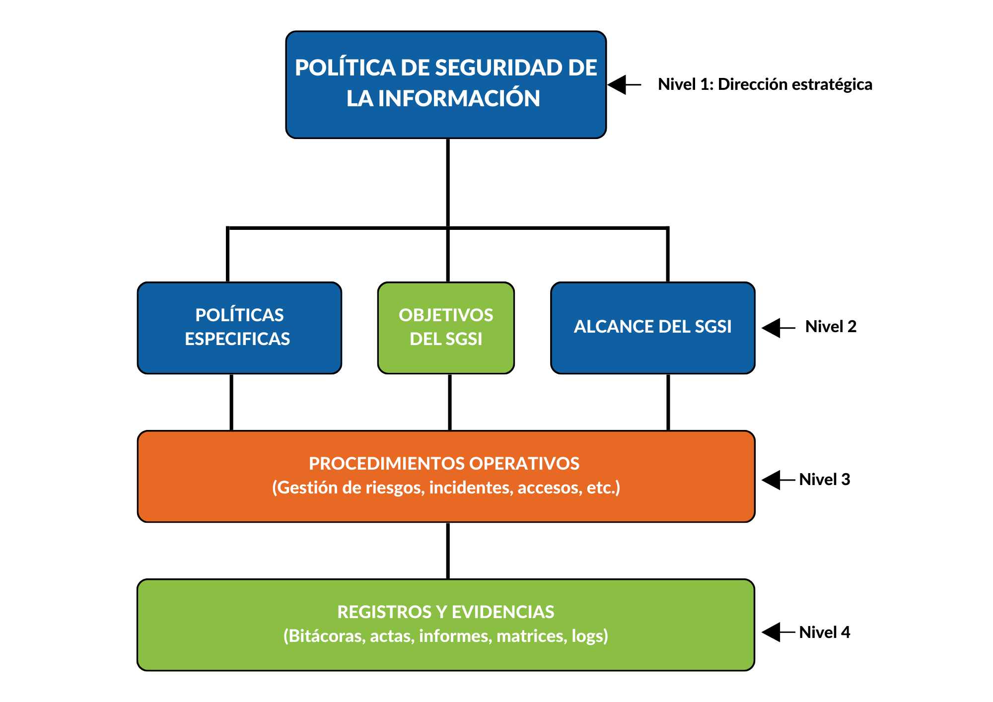 La norma ISO/IEC 27001:2022 establece una estructura documental jerárquica que toda organización debe mantener para demostrar la conformidad de su SGSI.